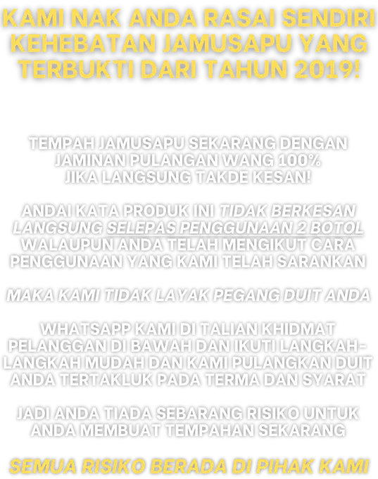 WE ARE COMMITTED TO PROVIDING HIGH-QUALITY PRODUCTS THAT MEET YOUR SATISFACTION. SUPPOSE FOR ANY REASON YOU ARE NOT COMPLETELY SATISFIED WITH YOUR PURCHASE OF JAMUSAPU. IN THAT CASE, YOU MAY REQUEST A REFUND UNDER OUR MONEY-BACK GUARANTEE POLICY, SUBJECT TO THE TERMS AND CONDITIONS.